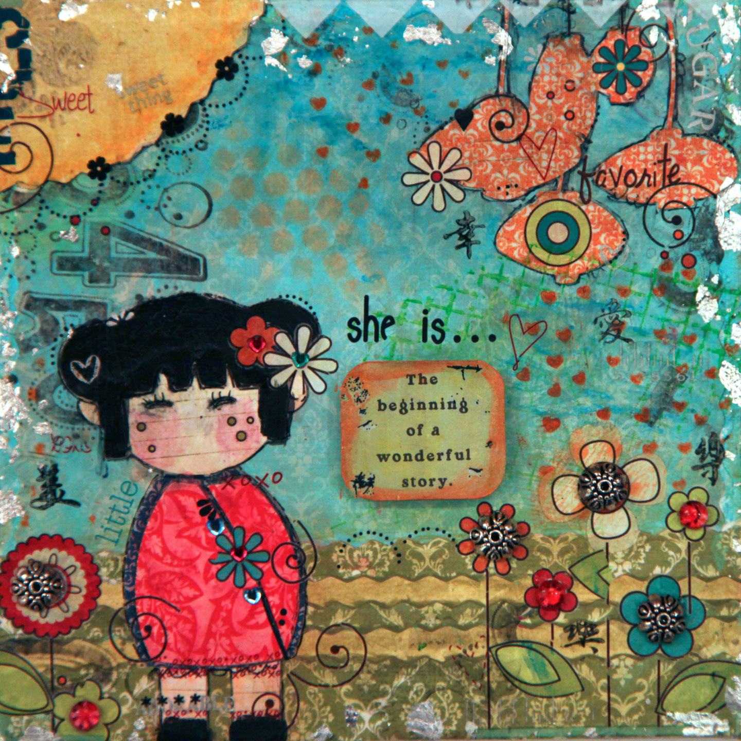 My girl really goes more with my fun, (going to label myself now) whimsical tendencies. These canvases are really fun to create and I get to use stash that I wouldn't normally. I grabbed a 6" paper pad I received in a Pink Paislee warehouse sale box, used bead caps that have been around since my polymer clay days, and rubons (BoBunny, Cosmo Cricket, We R Memory Keepers) that were left over from other projects. Even stamps. . . rarely do I ever use stamps but I managed to dig out different stamps.